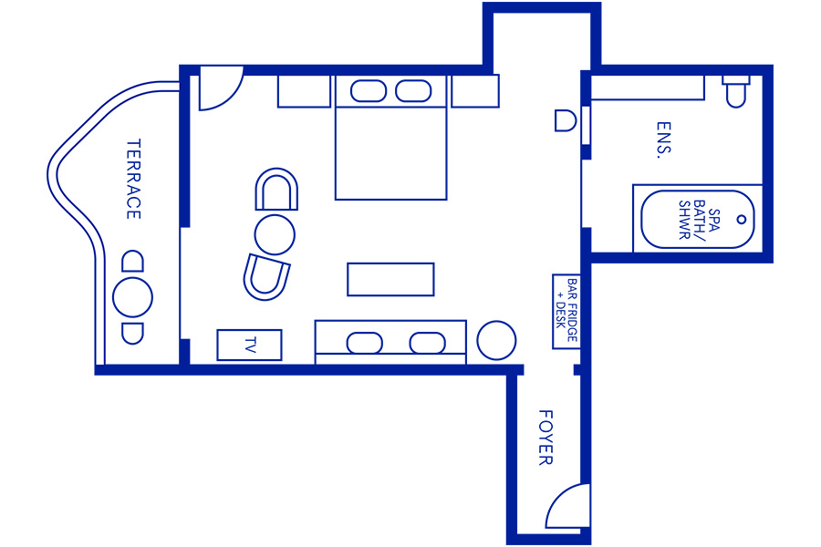 Serene garden retreat offering the perfect oasis for relaxation. This suite features a spacious open-plan layout, a luxurious marble and mosaic-tiled bathroom with a spa bath, king-size bed, and banquette lounge.